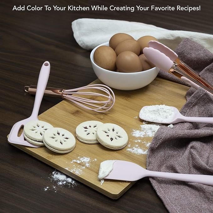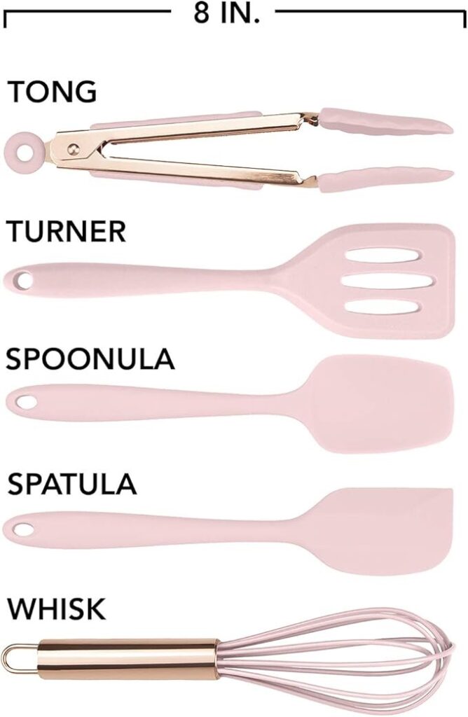 REFRESHING AND STYLISH – Designed in a fresh and bright pink color and a rose gold metallic tone, this set of mini silicon kitchen tools has an up to date, trendy look that is madly in line with the current styles and trends. Add a splash of color and funk to your kitchen and hang from the rings on each utensil. Cook, bake, grill and serve with fun and fashion at the same time. great for an impressive present as well.