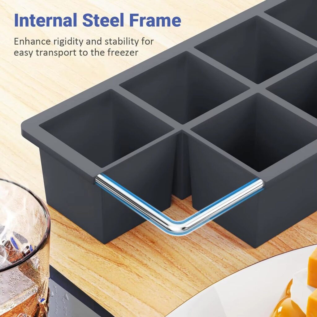 SILICONE ICE CUBE TRAYS: Square ice cube tray for freezer are made of high-quality food-grade silicone and can withstand long-term low-temperature storage. The silicone-wrapped steel frame adds stability to the whisky ice cube tray and makes it easy to transport the large ice tray from the sink to the freezer. Old fashioned ice cube tray is dishwasher safe and easy to clean.