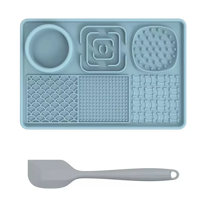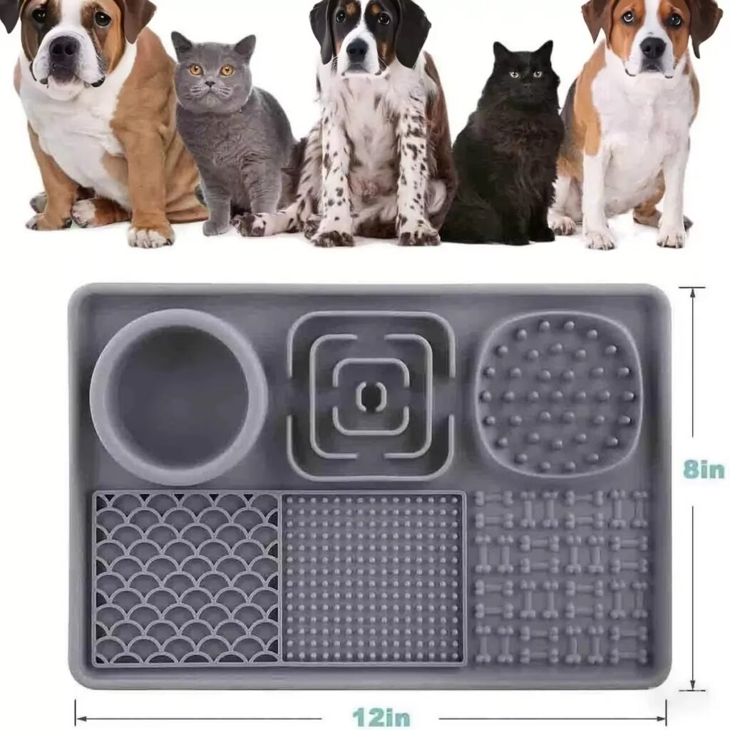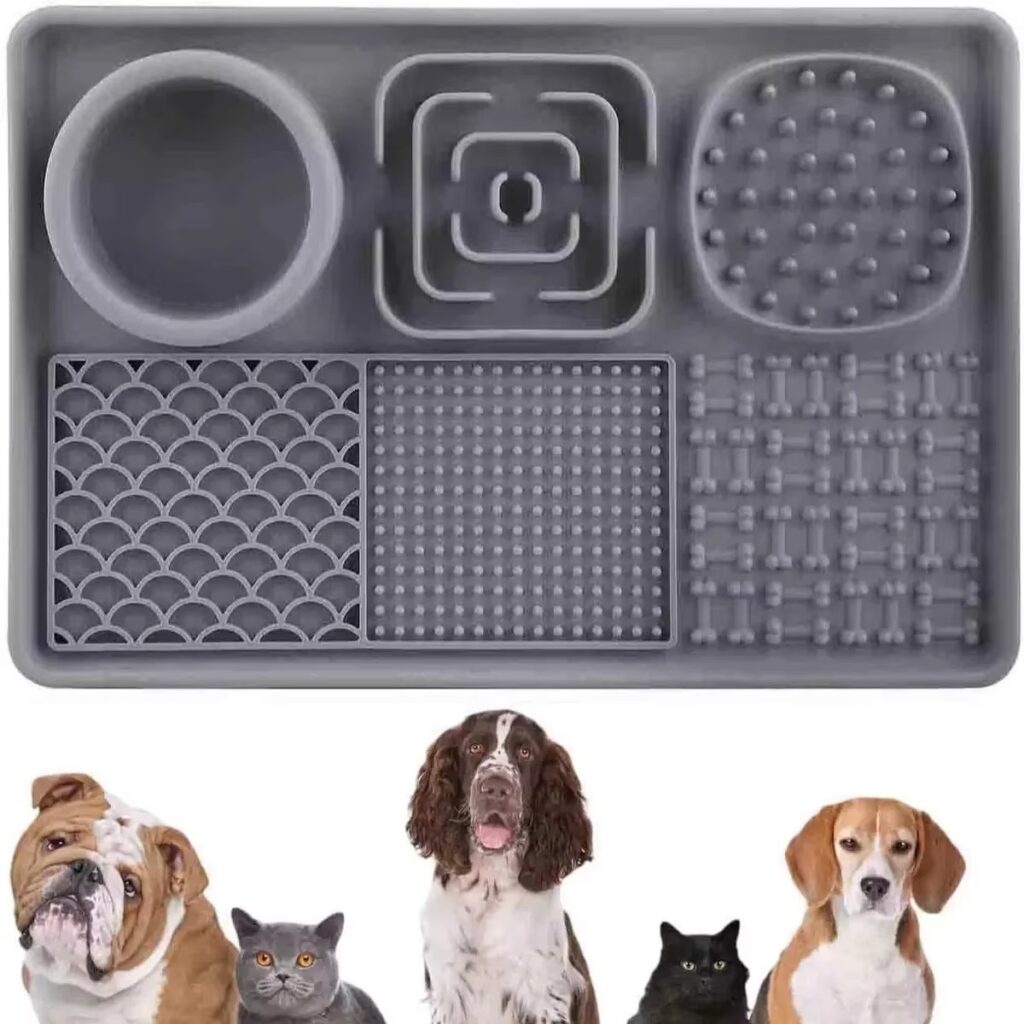 Multi-functional pet feeding mat with 6 textured zones, including slow feeder, licking areas, and water bowl. Made of durable food-grade material, it promotes healthy eating, reduces anxiety, and is easy to clean—perfect for cats and dogs of all sizes.