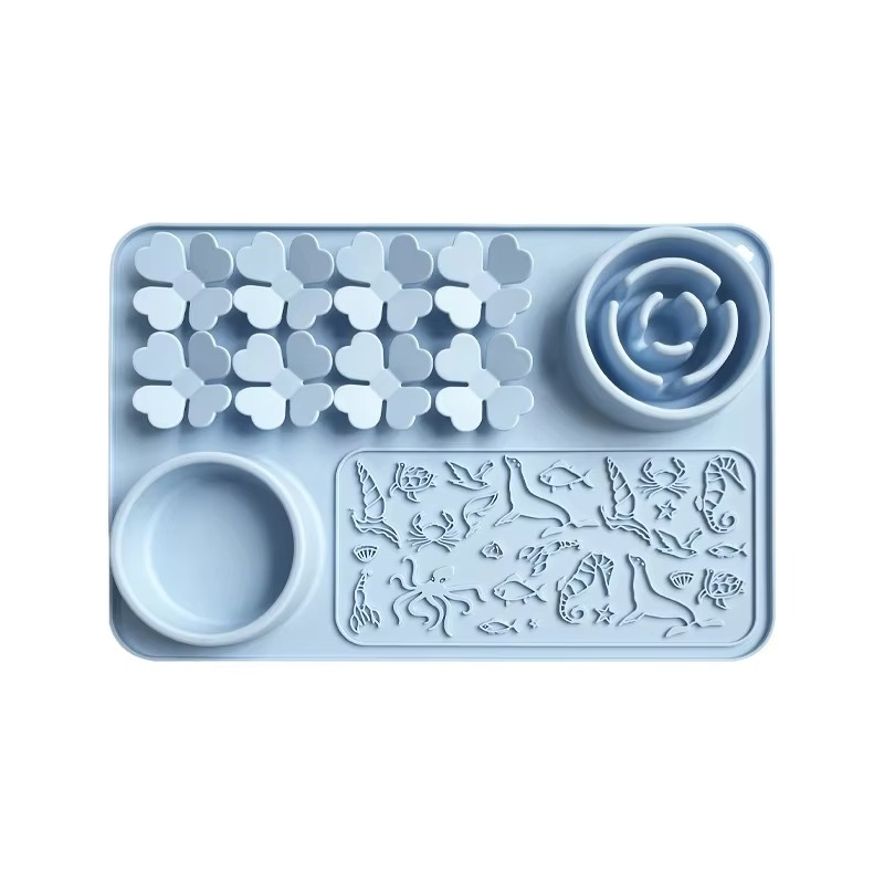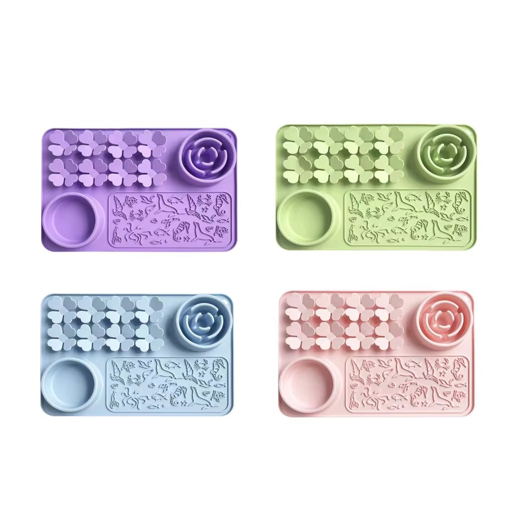 4-in-1 Multi-Functional Design: Our rectangular multi-functional mat combines four functions in one, including a slow feeder bowl, a water bowl, a licking area (perfectly suitable for soft cheese, peanut butter, frozen yogurt, etc.) and a sniffing area. This lick mat for dogs meets all the needs of your pet in terms of eating, drinking, licking, and sniffing, providing comprehensive care for your furry friend