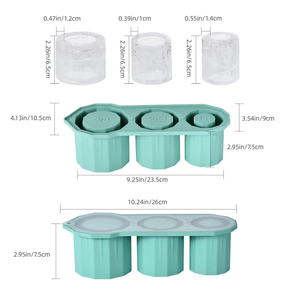 Size of ice mold- This ice cube tray can change 3 large hollow cylinder in cubes in different sizes. 1st+2nd are compatible with 20oz stanley cups, 2nd+3rd are compatible for 30oz stanley cups, 1st+2nd+3rd are compatible for 40oz stanley cups.