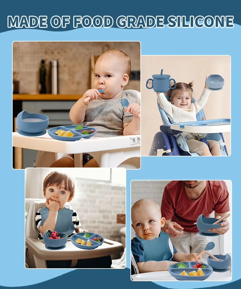 Made of 100% Food Grade Silicone: safe and suitable for first stage babies and toddlers, easy to clean and dishwasher safe. Our utensils, bowls, plates, and bibs are made of 100% food grade silicone, which is safer than plastic or glass.