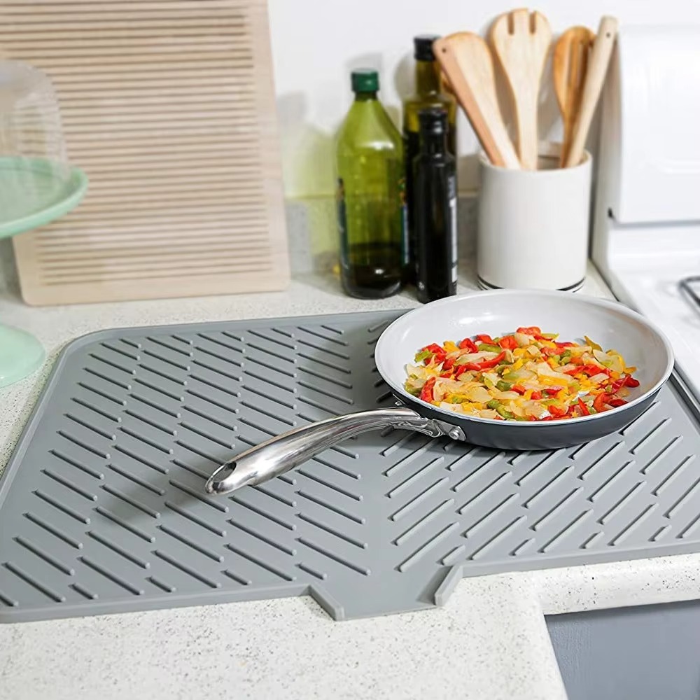 Wholesale Food Grade Silicone Dish Drying Mat With Built-in Drain Lip Drying Pad Kitchen Counter Silicone Large Dish Drying Pad