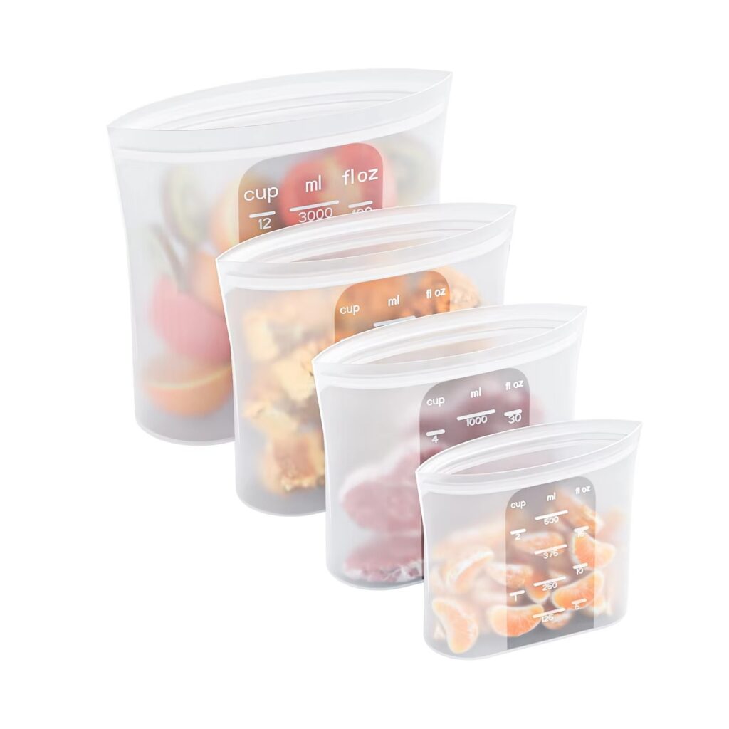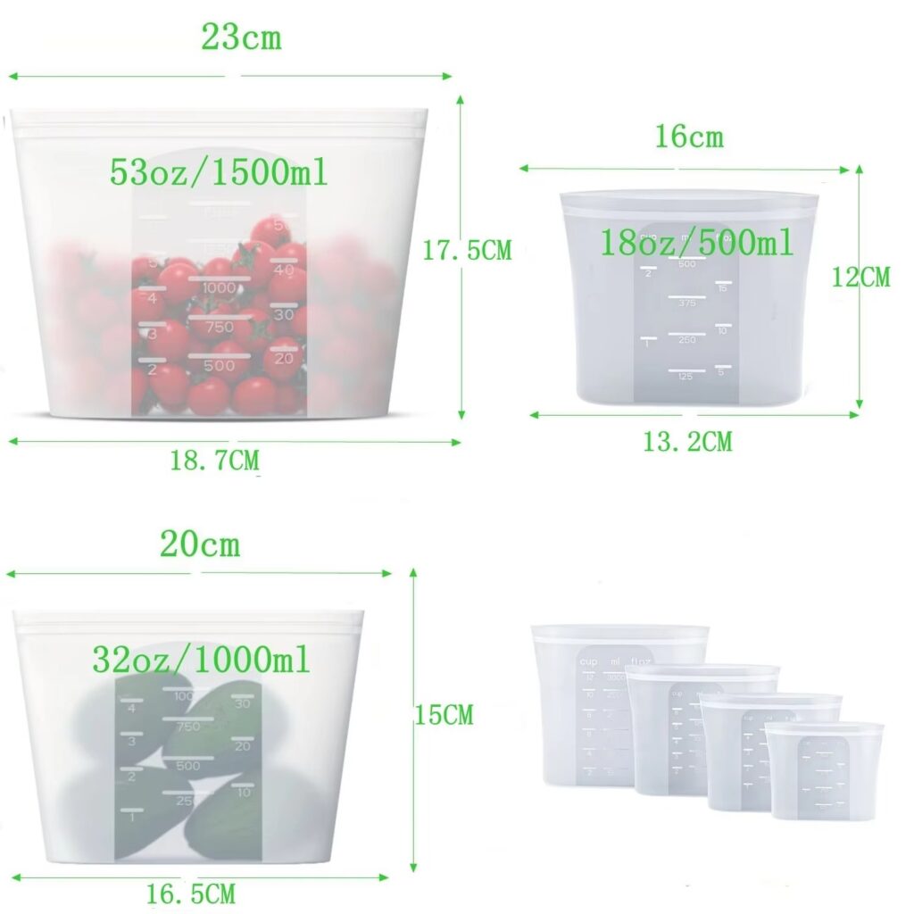 Size-flexible Solutions for All Scenarios:4 different size reusable silicone food storage bags. Includes 2 Cup (15 Fl Oz), 4Cup (30 Fl Oz), 6 Cup (50 Fl Oz) and 12 Cup (100 Fl Oz) bag,our set offers a variety of sizes to suit your storage needs.