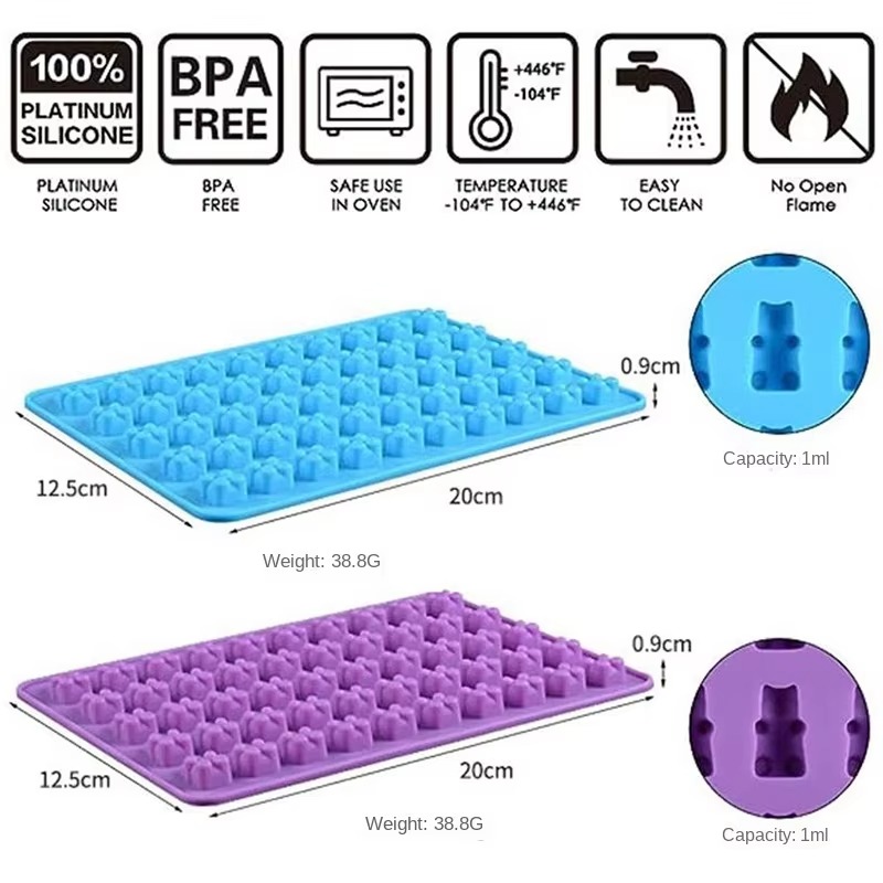 - PREMIUM FOOD-GRADE SILICONE MATERIAL: Crafted from carefully selected food-grade platinum silicone, BPA free, no odor, and certified by LFGB, the gummy molds ensure safety and quality. They withstand temperatures from -22°F to 446°F that are suitable for microwave, oven, refrigerator. It can be used to make gummies, chocolates, ice cubes, jellies, hard candies, pet treats, and even wax melts.