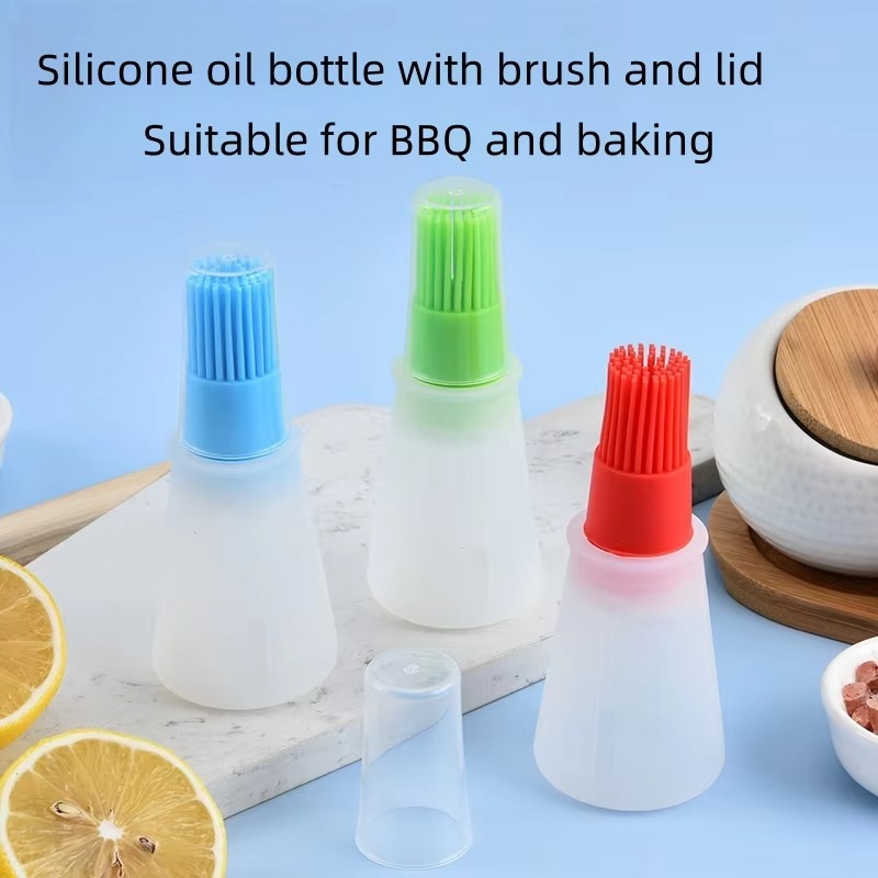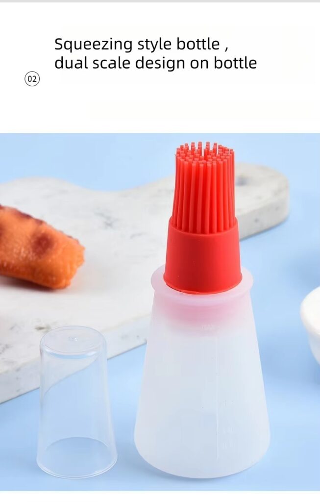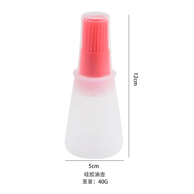 This multifunctional 60ml kitchen silicone oil brush (12cm x 5cm/4.72in x 1.96in) has a bottle to hold soy sauce, honey, etc., suitable for baking (jam), barbecuing (steak oil), frying eggs, etc.; made of food-grade silicone with a clear bottle body (easy to identify contents), heat-resistant (-40℃ to +230℃), easy to carry (scaled, smooth feel, for outdoor/kitchen use) and clean (wash with soap and warm water, hang to dry), plus a cap design.
