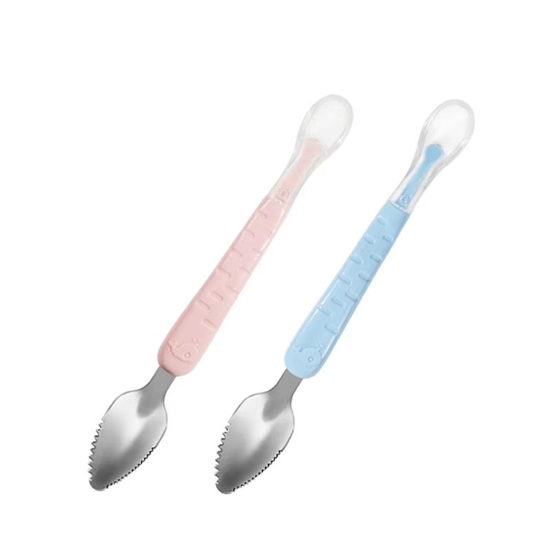 Multifunctional Design: the baby food spoon is designed with double ends, including 1 soft silicone spoon head for baby food feeding and 1 stainless steel scraper head for fruit scraping, the zigzag scraper is smooth and safe to use for babies