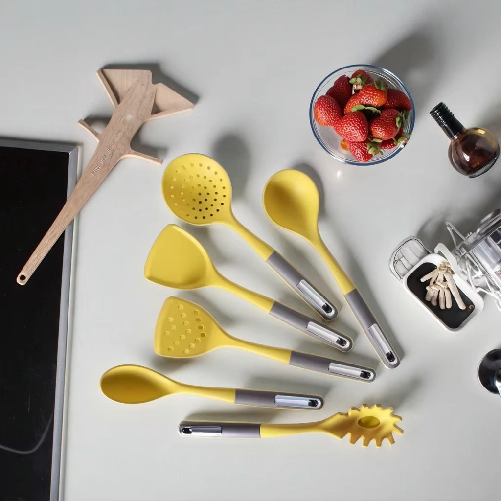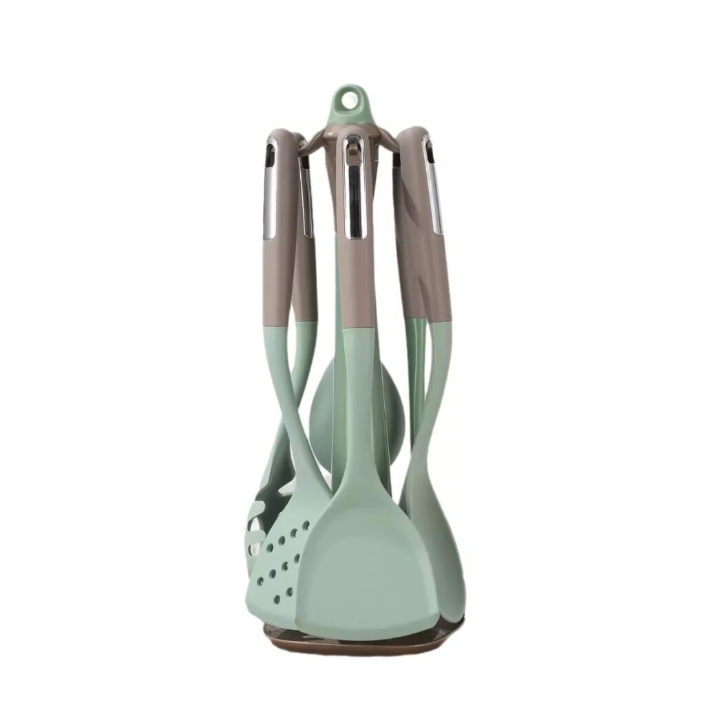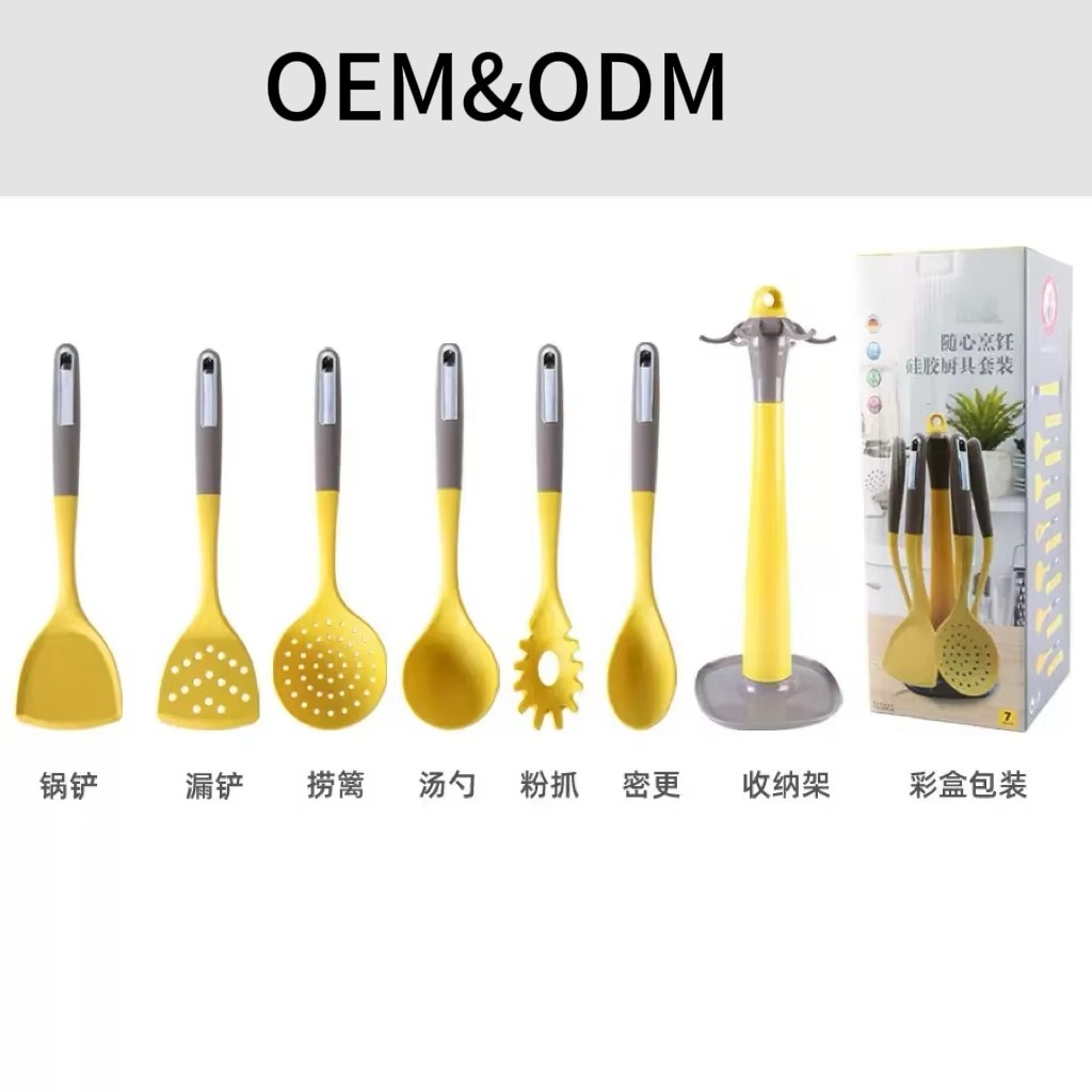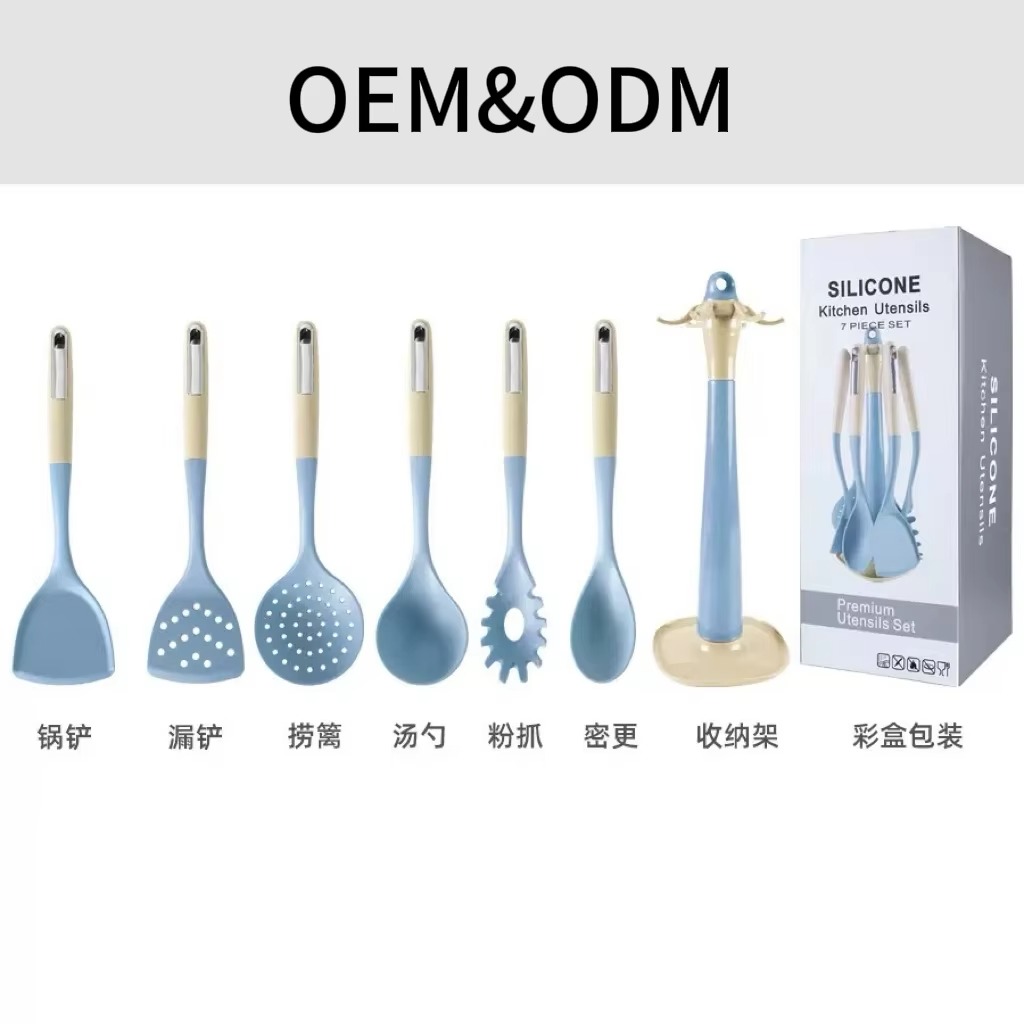 Two-Tone 7-Piece Non-Stick Silicone Mold Cookware Set Utensil Kitchen Ware Food-Graided Cleaning Features PP Nylon Storage Rack