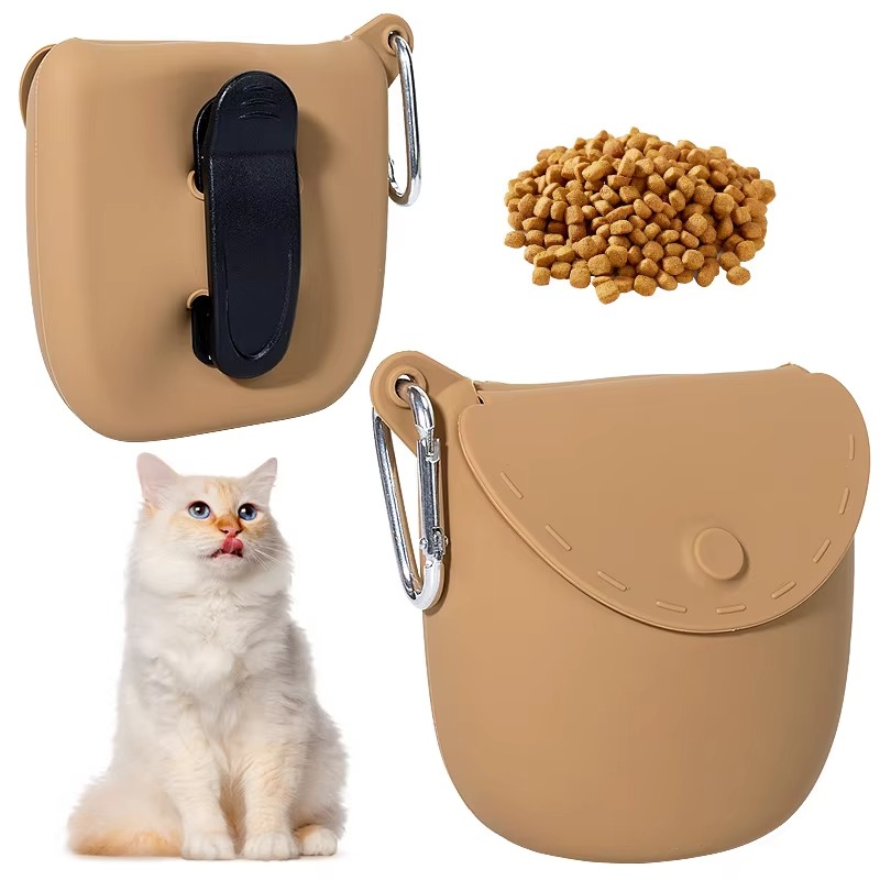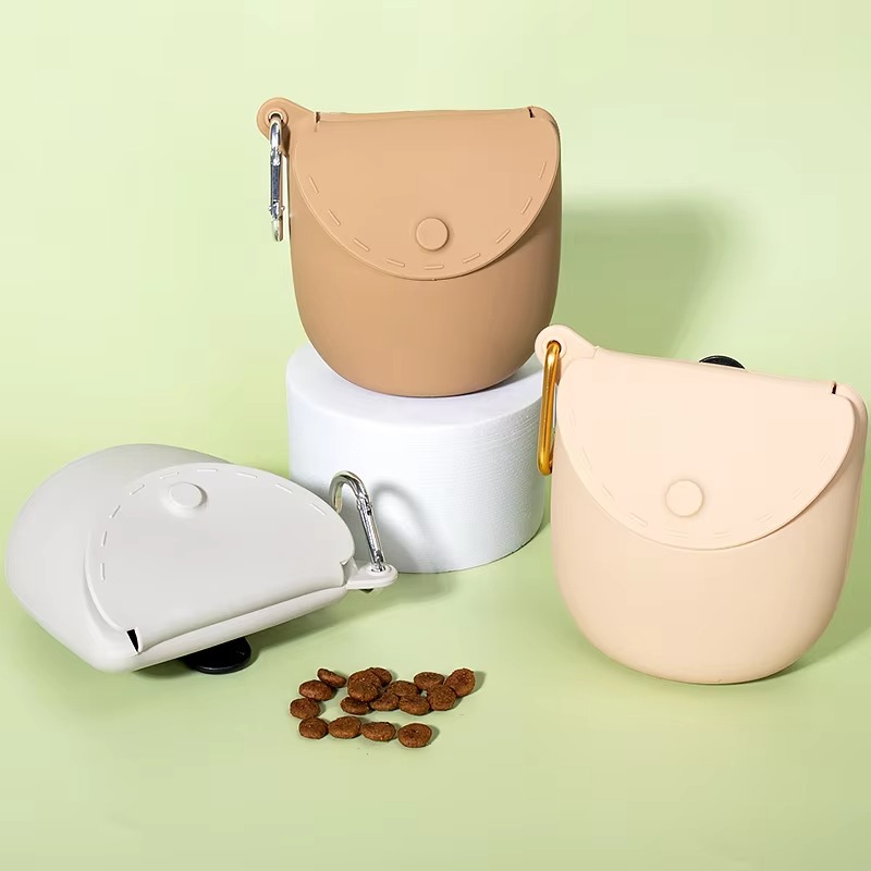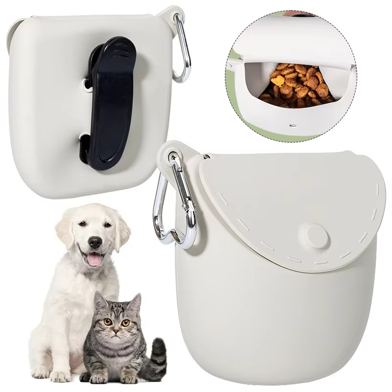 This all-in-one dog walking bag combines a pet food container, training treat pouch, and hiking food pouch—ideal for daily walks, training, or outdoor adventures. It features a secure magnetic flip lid (snaps shut instantly to prevent spills) with a wide opening for one-handed treat access, perfect for quick training rewards. Made of durable, food-grade silicone, it includes a removable waist clip and gold metal carabiner for hands-free carrying (attach to belts, backpacks, or leashes). Compact yet spacious, it holds up to 1.5 cups of kibble/treats without bulk, fitting easily in purses or car consoles. Easy to wipe clean (rinse or damp cloth), odor-resistant, it’s an essential tool for puppy training and adult dog care, compatible with all dog travel accessories.